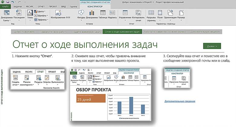 С помощью MS Project можно создавать лаконичные, яркие и профессиональные отчеты без экспорта данных в другую программу. Для этого следует просто добавить рисунки, диаграммы, анимацию, ссылки и другие элементы, которые помогут понятно и доступно донести заинтересованным лицам и команде данные о состоянии проекта.