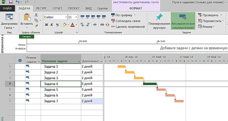 При выборе задачи все ее предшественники будут выделены одним цветом, а последователи – другим.