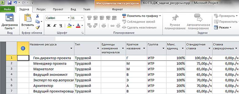 Ресурсы можно вводить в проект, например, в представлении Лист ресурсов (рис. 32).