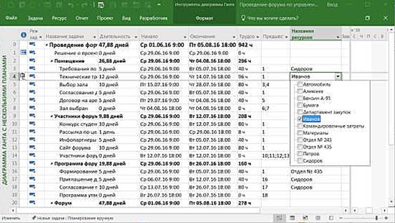 Назначение ресурсов на задачи можно осуществлять разными способами, например в стандартном представлении Диаграмма Ганта в поле «Названия ресурсов» можно выбрать из выпадающего списка ресурсы, требуемые для выполнения задачи.