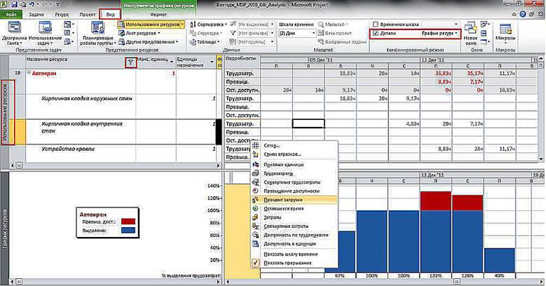 Рис. 35. Анализ загруженности ресурса в представлении Использование ресурсов