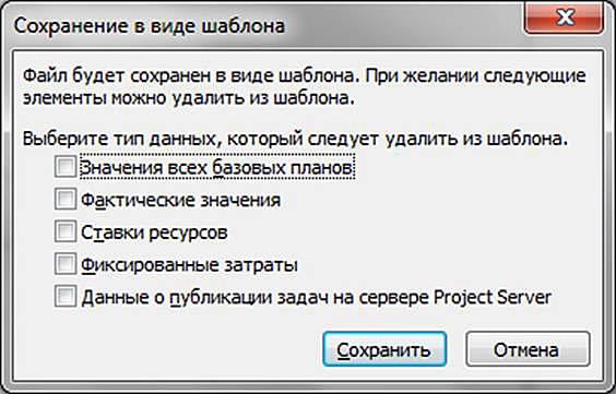 Можно использовать файл проекта для создания шаблона проекта компании, если проекты схожи по структуре, требованиям к календарю или ресурсам, если сохранить его соответствующим образом (см. рис. 36).