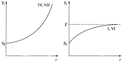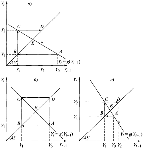 Условие (5), эквивалентное (1), представляет собой однородное разностное уравнение первой степени, описывающее динамику отклонения дохода текущего периода от равновесного в зависимости от разницы между доходом прошлого периода и равновесным значением. Так как согласно предпосылкам модели то упомянутая зависимость отрицательна. Другими словами, чем больше доход прошлого периода превышал равновесный, тем ниже будет доход текущего периода в сравнении с равновесным.