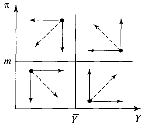 Рассмотрим вначале упрощенный случай этой модели, где отсутствуют отмеченные выше лаги и учитывается только взаимодействие мультипликатора и акселератора, связывающего величину инвестиций не с абсолютным уровнем выпуска, а с его изменением. Существование жесткой связи между изменениями в доходе и инвестициями или допущение об акселераторе уже без учета лагов позволяет выявить принципиальную возможность существования циклических колебаний в экономике.
