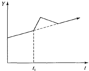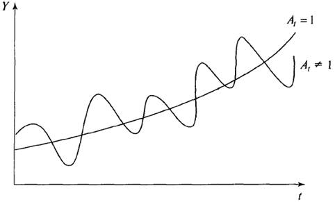 В основе детерминистского подхода к колебаниям экономической активности лежит представление, что деловые циклы воспроизводят себя сами, т. е. в ходе развития экономики порождаются силы, которые то ускоряют, то замедляют ее развитие. Одна из возможных причин такого положения заключается в наличии лагов - систематических задержек в реакции на изменение условий экономической деятельности. Например, согласно кейнсианским теоретическим представлениям величина потребительских расходов С, зависит от располагаемого дохода текущего периода : .