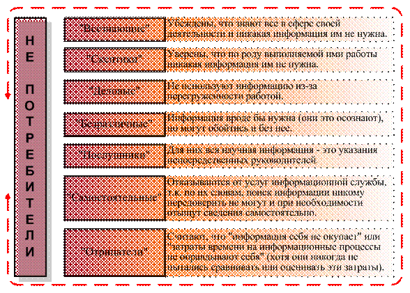 На рис. 13, приведена классификация "не потребителей" информации данная О.Е. Бурым-Шмарьяном. Их основной довод не потребления - "в имеющемся на фирме информационном фонде нет нужной мне информации", "не удовлетворяются мои частные запросы по информационному обеспечению". Причина такого положения вещей в непонимании специалистами задач использования информации в повседневной работе, незнание возможностей информационной службы, неумение работать с информацией, неумение сформулировать информационный запрос и многое другое.
