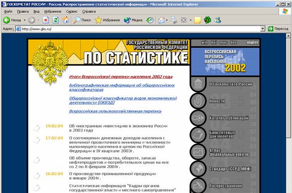 Госкомстат России обеспечивает официальной статистической информацией, являющейся частью государственных информационных ресурсов о социально-экономическом и демографическом положении страны, федеральные органы государственной власти, органы государственной власти субъектов Российской Федерации, органы местного самоуправления, граждан и организации.
