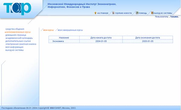 В Московском международном институте эконометрики, информатики, финансов и права успешно реализуется принцип интегрированного электронного обучения. На сегодняшний день вышла в свет первая в России серия учебных курсов, систематически знакомящая учащихся с укрупненными блоками дисциплин и выполненная в форме интегрированных курсов: