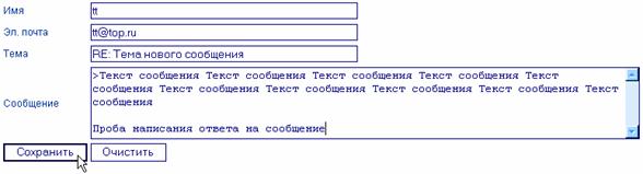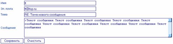 Поля «Имя» и «Эл. почта» заполняются автоматически регистрационными данными. В графе «Тема» выводится тема того сообщения, к которому пишется ответ. При желании это название можно заменить своим собственным. Кроме того, текст исходного сообщения выводится в графе «Сообщение», закомментированный символом «>». Этот текст можно, по желанию, оставить или стереть, после него вводится текст Вашего сообщения.