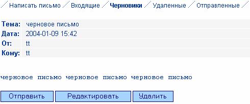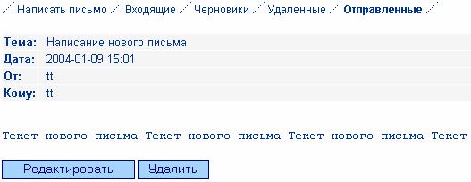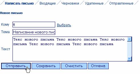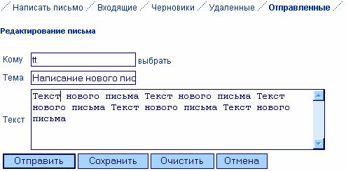 После ввода текста сообщения в графу «Текст» необходимо нажать на кнопку «Отправить» для немедленной отправки письма или на кнопку «Сохранить» для того, чтобы данное письмо поместилось в раздел «Черновики». Редактирование письма происходит аналогично, как в разделе «Отправленные» или «Черновики».