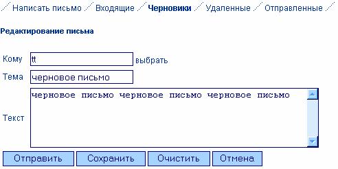 Изменив содержимое письма, его можно отправить адресату, нажав при этом кнопку «Отправить», или же повторно сохранить в папку «Черновики», для чего надо нажать кнопку «Сохранить».