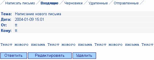 Здесь можно прочитать письмо, выбрав соответствующую ссылку в графе «Тема». Далее можно ответить на полученное письмо, отредактировать или удалить его.
