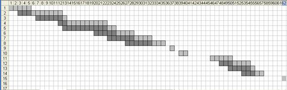 Чтобы получить такую характеристику СМО можно построить диаграмму, состоящую из горизонтальных параллельных отрезков. Каждый отрезок связан с определенным клиентом, а его длина соответствует длительности ожидания данным клиентом (на рисунке ниже черный фон) и длительности обслуживания (серый фон). Сверху проводится базисная линия, на которой откладывается текущее время (в редакторе Excel в качестве такового можно использовать строку с номерами столбцов). Каждый отрезок должен начинаться в момент прибытия клиента и оканчиваться в момент начала обслуживания. Таким образом, можно определить число ожидающих клиентов и длительность ожидания для этого числа клиентов.