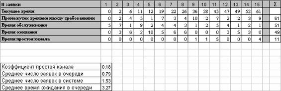 Для получения статистически значимых данных о реальном процессе потребовалась бы значительно большая выборка (см., например, раздел Ошибка! Источник ссылки не найден.), однако приблизительную оценку некоторых важных характеристик системы массового обслуживания можно получить и в данном случае. Как видно из данных таблицы, десять клиентов из пятнадцати ожидают. Среднее время ожидания для этих клиентов равно 49/10; среднее время ожидания для всех клиентов равно 49/15.