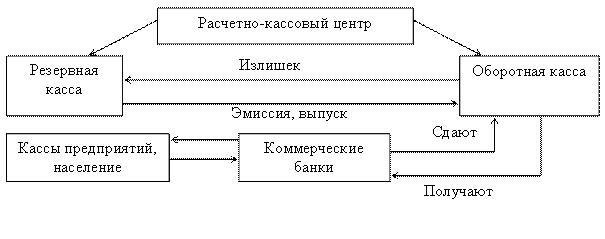 Эмиссию денег производит Банк России и его РКЦ (расчетно-кассовые центры). РКЦ открываются в районах страны и выполняют расчетно-кассовое обслуживание в расположенных в этих регионах коммерческих банках. Для эмиссии наличных денег в РКЦ открываются резервные фонды и оборотные кассы.