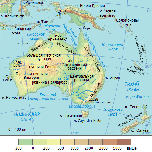 В основании материка лежит Австралийская платформа. На востоке находятся сильно разрушенные, невысокие горы древней складчатости – Большой Водораздельный хребет. К западу материка горы переходят в центральную низменность. Западная часть материка приподнята. Австралия – единственный материк, где нет действующих вулканов.