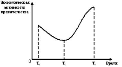 Политико-экономический (политический) цикл (political business cycle) - цикл экономической и политической активности правительства между выборами. Деятельность правительства между выборами подчинена определенным закономерностям. С известной долей условности она может быть описана следующим образом. После выборов осуществляется ряд мер, направленных на изменение целей или масштабов деятельности предшествующего правительства. Эти меры носят особенно радикальный характер, если к власти приходит партия, до этого находившаяся в оппозиции. Предпринимаются попытки по сокращению дефицита государственного бюджета, сворачиванию непопулярных программ, перестройке работы государственного аппарата. Вновь пришедшие к власти люди стараются выполнить хотя бы часть предвыборных обещаний. Однако затем активность снижается до тех пор, пока падение популярности нового правительства не достигает критического уровня. С приближением следующих выборов активность правительства возрастает. Если отложить на оси абсцисс время, а на оси ординат — активность правительства, то описанный цикл в общем виде будет выглядеть примерно так (рис. 170).