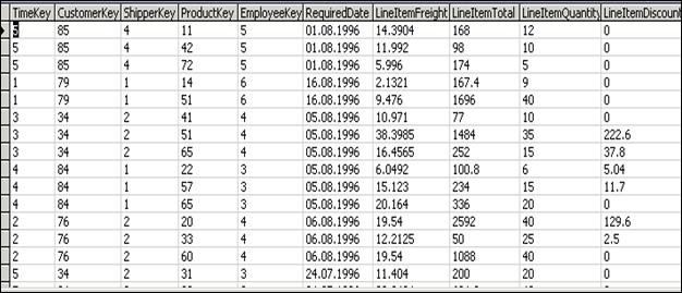 Перечислим отображаемые в запросе поля таблиц: “Группа товаров”, “Наименование товара”, “Сотрудник”, “Регион”, “Страна”, “Город”, “Компания”, “Дата”, “Скидка” и “Количество”. В этот список входят все информативные поля, используемые при анализе. Поля-идентификаторы не включены в список, т.к. в отчетах они фигурировать не будут.