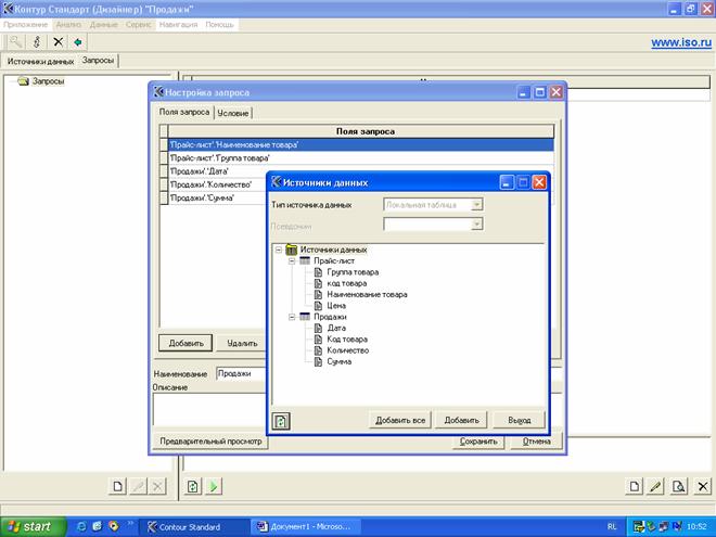 Далее создаем запрос – “выборку” в терминах “Контур Стандарт”. Здесь описываются отображаемые поля, связи таблиц по ключевым полям, условия фильтрации. Таким образом, запрос описывает алгоритмы генерации SQL-запросов к источникам данных.