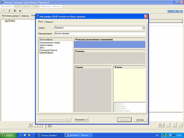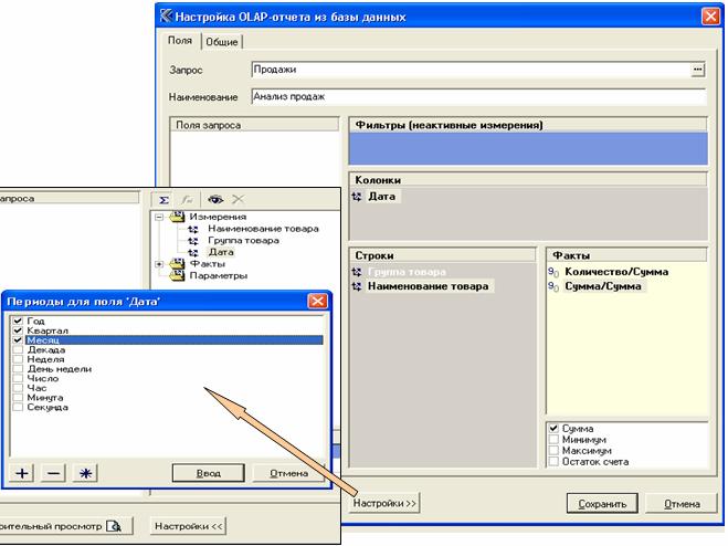 Рисунок 10. Определение измерений таблицы и настройка OLAP-отчета