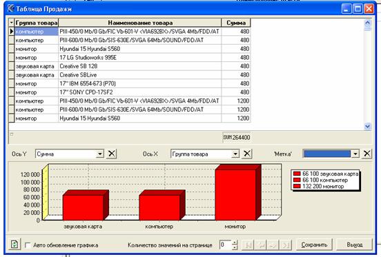 Далее на базе сформированной выборки создадим отчет. Он представляет собой пользовательский интерфейс, который позволяет интерактивно управлять структурой данных динамической таблицы, графической иллюстрацией и печатью отчетов.