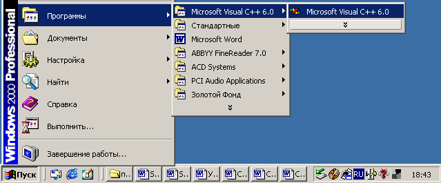 Вызов Visual C++ 6.0 осуществляется через меню «Пуск» -> «Программы» -> «Microsoft Visual C++ 6.0» ->Microsoft Visual C++ 6.0 (рис.2.1)(на вашем компьютере путь может быть другим):
