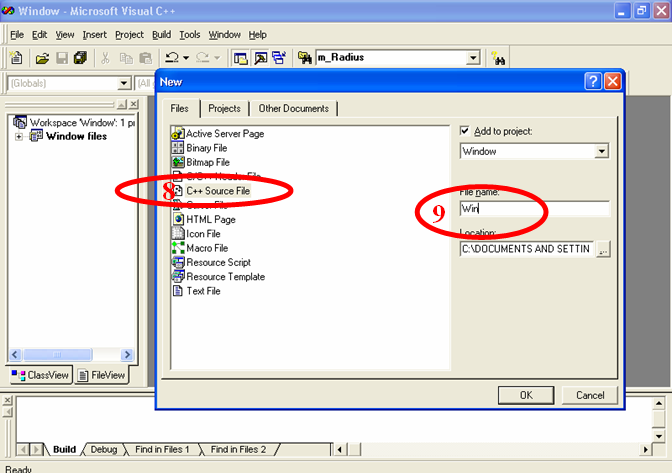 7. Откроется окно (рис.2.7), в котором необходимо выбрать из списка C++ Source File (Исходный файл C++). Задайте имя файла в поле File name (Имя файла), например Win. Нажмите ОК.