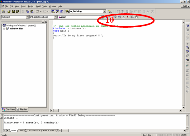 8. Теперь наберите в области редактирования программу на языке C++, которая выведет на экран строку: It is my first program!!!