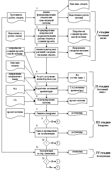 • четвертый цикл (блоки: 12, 5 - 12) возникает в том случае, когда требуется модификация системной архитектуры в связи с необходимостью адаптации проекта к новым условиям функционирования системы;