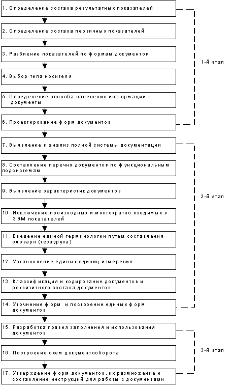 На третьем этапе составляются технологическая документация и инструкции, описывающие правила заполнения, передачи, использования и хранения документов, схемы документооборота, отражающие все операции, выполняемые над документами, и подразделения, в которых они происходят, начиная от выписки и кончая сдачей их в архив.