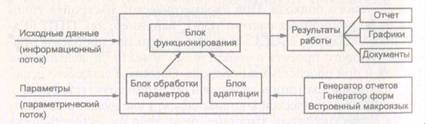 При проектировании ЭИС на основе параметрической настройки пакета прикладных программ (ППП) последний рассматривается как «черный ящик» (рис. 8.3). На вход ППП подаются параметрический (ПП) и информационный (ИП) потоки, а выходом служит результат работы пакета. ППП включает следующие блоки: функционирования, обработки параметров, адаптации.