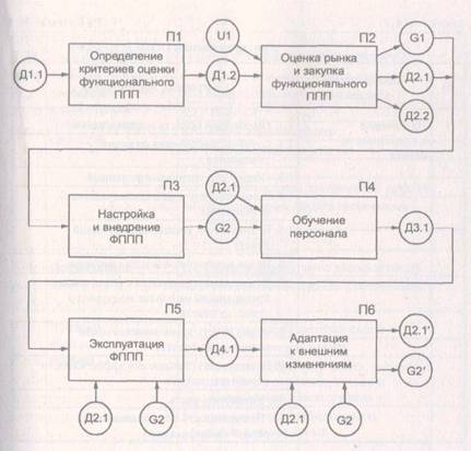 Сущность применения метода типового проектирования ЭИС на основе параметрической настройки ППП заключается в определении критериев оценки ППП, оценке множества ППП-претендентов по сформулированным критериям, выбору и закупке ППП с наивысшей интегральной оценкой, а далее - собственно настройке параметров и возможной доработке закупленного ППП. Технологическая сеть проектирования с помощью параметрической настройки функционального ППП представлена на рис. 8.4.