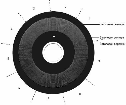 В начале каждого сектора находится особая область, в которую записываются идентификационная и адресная информация. В области перед первым сектором записываются заголовки дорожки и сектора. Перед остальными секторами записываются лишь заголовки сектор. Область между заголовками предназначена непосредственно для записи данных.