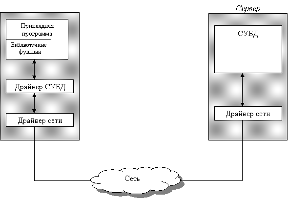 Каждая СУБД помимо интерактивной SQL-утилиты обязательно имеет библиотеку процедур доступа и набор драйверов СУБД для различных операционных систем. Схема взаимодействия клиентского приложения с сервером базы данных в этом случае представлена на Рис. 19-10: