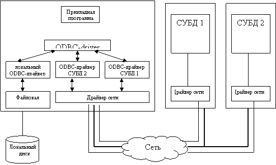 В архитектуре ODBC используется один ODBCDriverManager и несколько ODBC-драйверов, обеспечивающих доступ к конкретным СУБД. DriverManager связывает приложение и интерфейсные объекты, которые выполняют обработку SQL-запросов к конкретной СУБД.
