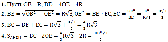 В ромб вписана окружность радиуса R. Найти площадь ромба, если его большая диагональ в 4 раза больше радиуса вписанной окружности.