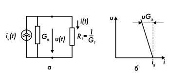 Идеальный источник, или генератор, тока — активный двухполюсник, ток через который не зависит от напряжения на его зажимах. Обозначение источника тока на схеме с подключенной к нему нагрузкой (сопротивлением), а также вольтамперная характеристика для него представлены на рис. 7.4. Несложно показать, что мгновенная мощность, отдаваемая источником тока во внешнюю цепь, будет отрицательной - свойство, присущее активному элементу.