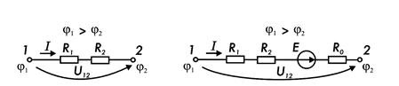 где j1 и j2 — потенциалы точек 1 и 2 цепи (j1 > j2); U12 = j1 - j2 - напряжение (разность потенциалов) между точками 1 и 2 цепи; ∑R - арифметическая сумма сопротивлений на участке цепи; R1 и R2 — сопротивления участков цепи.