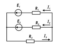 Для электрической цепи постоянного тока (рис. 7.13) определить токи I1 … I3 в ветвях. ЭДС Е1 = 10 В; Е2= 20 В; сопротивления резисторов: R1 = 10 Ом; R2 = 20 Ом; R3 = 15 Ом.