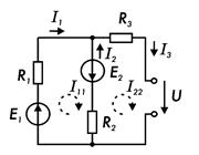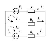 При этом токи во внешних (несмежных) ветвях электрической цепи оказываются численно равными соответствующим контурным токам: I1 = I11; I3 = I22. Ток в смежной ветви определяют из уравнения, составленного по первому закону Кирхгофа для точки разветвления электрической цепи: I1 - I2 - I3 = 0, откуда I2 = I1 - I3 = I11 - I22.
