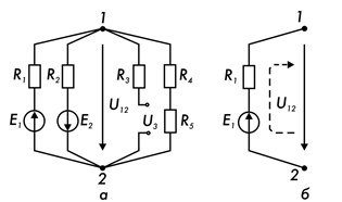 Знаки в расчетной формуле не зависят от направления токов в ветвях электрической цепи. С учетом этого выражение для напряжений между узлами 1 и 2 цепи записываем в следующем виде: