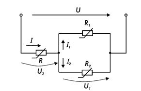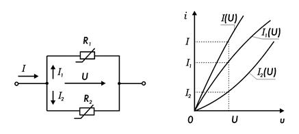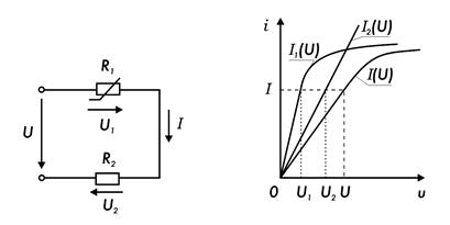 При этом образуется нелинейная электрическая цепь с последовательным соединением сопротивлений, для которой строится общая вольтамперная характеристика I(U) с учетом того, что подводимое к цепи напряжение U при данном токе цепи I равно сумме напряжений на параллельном U1 и на последовательном U2 участках цепи (U = U1 + U2).