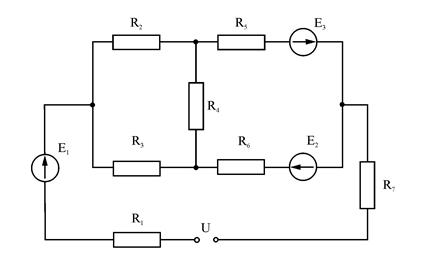 2. Электрическая цепь постоянного тока содержит источник питания: Е1 = 50 В, Е2 = 20 В и Е3 = 45 В. Сопротивления, включенные в цепь, имеют номиналы: R1 = 10 Ом, R2 = 30 Ом, R3 = 50 Ом, R4 = 20 Ом, R5 = 1 Ом, R6 = 20 Ом, R7 = 10 Ом. Напряжение, приложенное к цепи, U = 80 В. Внутренними сопротивлениями источников пренебречь. Определить токи I1 – I6 в ветвях цепи, а также напряжение между токами 1 и 4 цепи. Определить величину падений напряжения на всех сопротивлениях цепи.