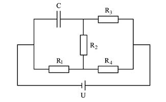 3. В электрической цепи постоянного тока, представленной на рисунке, напряжение U = 24 В, сопротивления R1 = 5 Ом, R2 = 10 Ом, R1 = 15 Ом, R1 = 25 Ом. Найдите напряжение на обкладках конденсатора С.