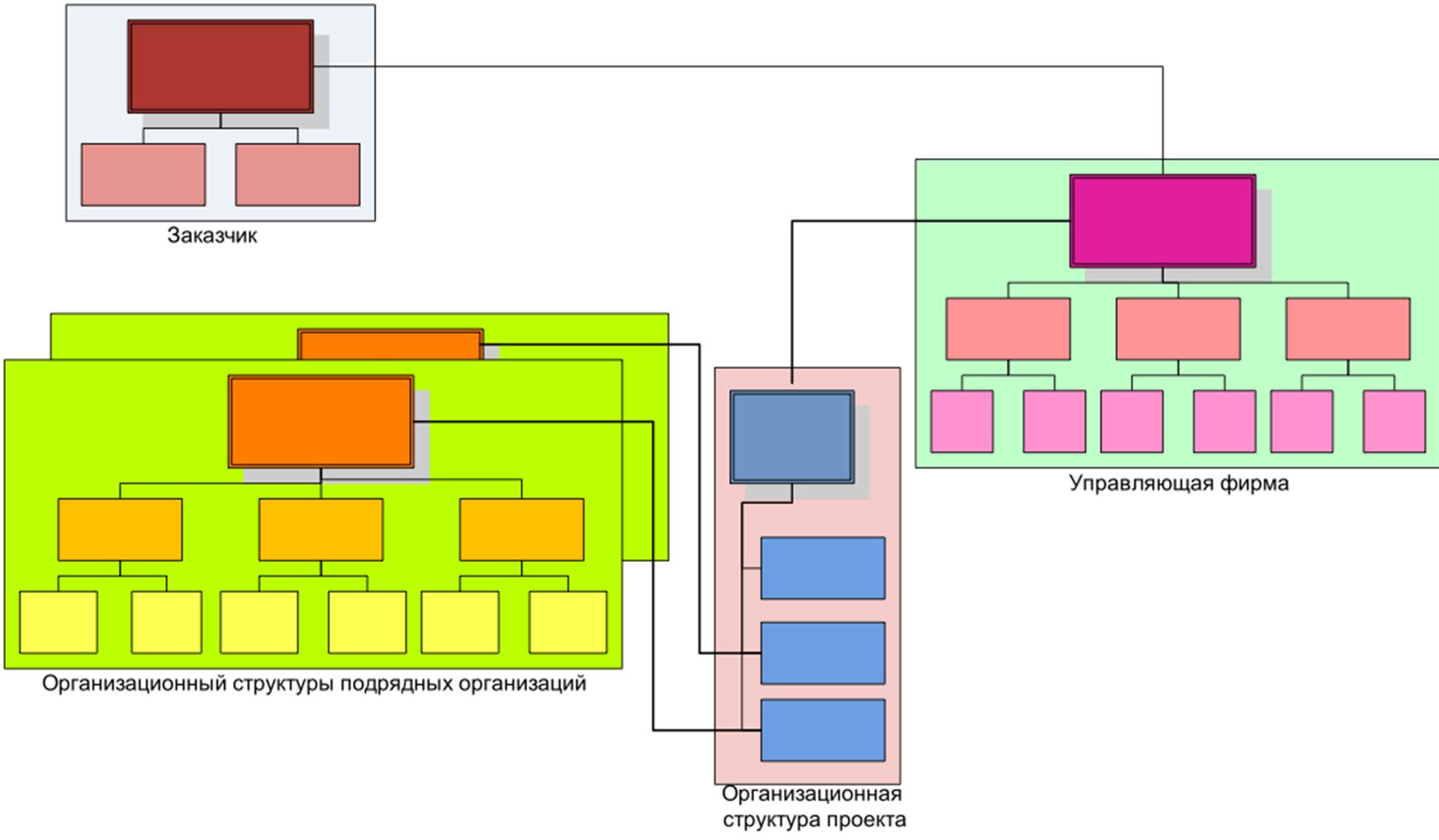 В случае участия в проекте двух или более различных компаний, имеющих различные значимые функции в проекте, используются т.н. «сложные» организационные структуры управления проектами, имеющие 3 принципиальные разновидности: