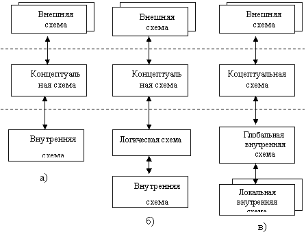 Пример, приведенный на рис. 3.2в, характерен для варианта распределенной базы данных, объединяющей информацию, представленную разными внутренними схемами.
