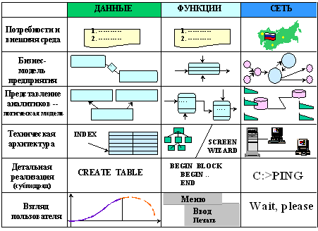 В [29] была предложена простая, но концептуально мощная схема, показывающая различные уровни представления архитектуры ИС, различные виды ее "обеспечения", а также их основные взаимосвязи. На рис. 5.3 показана таблица, представленная в [7], аналогичная схеме Захмана. Три столбца отражают три раздела обеспечения системы: информационный (ДАННЫЕ), функциональный (ФУНКЦИИ) и коммуникационный (СЕТЬ).
