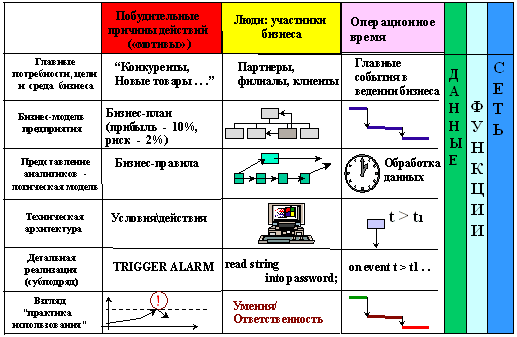 Позднее появилось развитие такой "плоской" модели. В [28] рассматривалась схема, представленная на рис. 5.4, включающая три новых столбца, в которых отражаются еще три раздела: побудительные причины действий системы, события и графики выполнения действий, а также "действующие лица" - люди и организационные структуры.
