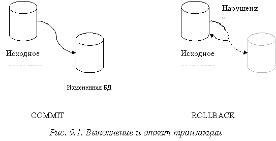 Для обеспечения контроля целостности каждая транзакция должна начинаться при целостном состоянии БД и должна сохранить это состояние целостным после своего завершения. Если операторы, объединенные в транзакцию, выполняются, то происходит нормальное завершение транзакции, и БД переходит в обновленное (целостное) состояние (ситуация COMMIT на рис. 9.1). Если же происходит сбой при выполнении транзакции, то происходит так называемый откат к исходному состоянию БД (ситуация ROLLBACK на рис. 9.1).