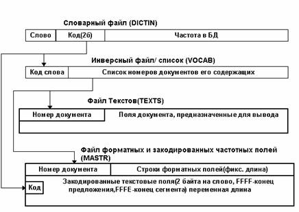 Инверсный файл текстовой части (DCIND) - список кодов слов и словосочетаний, сопровождаемых номерами страниц. Словарный и инверсный файл используются для сквозного полнотекстового поиска.